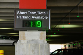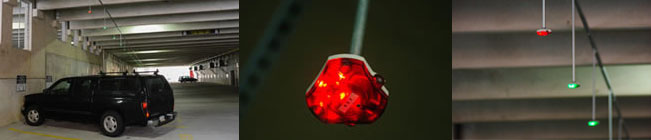 Ceiling-mounted sensors from Q-Free TCS turn red as a vehicle parks. In real time, the system monitors two hours of free parking, then sends notification when time has elapsed and fees will be charged. Customers are urged to use the Parkmobile app for alerts and payment options. |